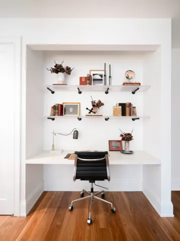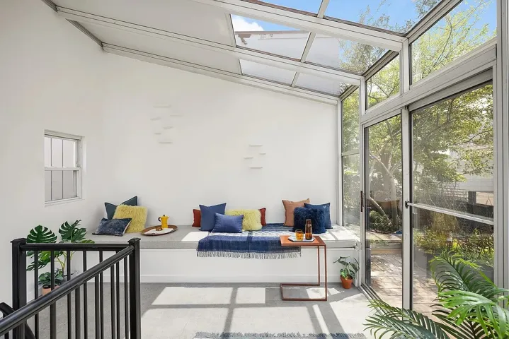 Upon entering, you’ll find a fully fitted, double-sized coat closet across from an attractive marble-topped home office space with opaque shelving. A solid spiral staircase ascends to the upper-level greenhouse lounge, a unique and charming feature of this home.