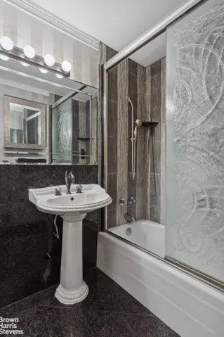 A top-of-the-line bathroom showcases timeless design with a classic white pedestal sink and quality finishes. The large bedroom enjoys peaceful north and west exposures, and the entire home is enhanced by central air conditioning/heating and excellent closet space throughout.