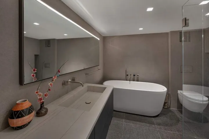 The primary bath features Boffi fixtures, a free-standing soaking tub, and a glass-enclosed rain shower, complemented by a convenient half bath upstairs.