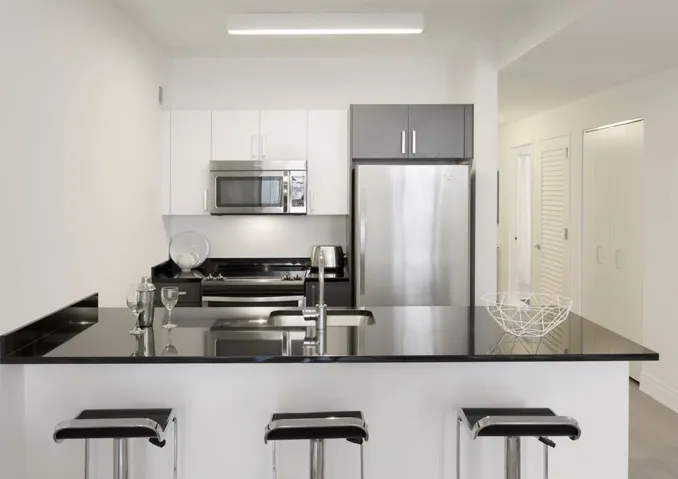 Spacious alcove studio with large flex space perfect for a home office or sleeping alcove, a walk-in closet, open kitchen with stainless steel appliances, stone counters and eating bar, and washer/dryer.