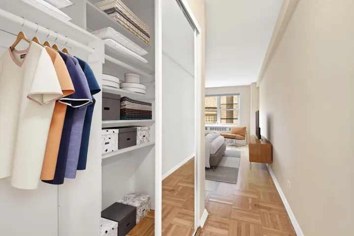 Spacious and versatile, this Junior-4 / Convertible 2-Bedroom home offers both comfort and flexibility in a prime Midtown East location. The apartment features a large living area, a generously sized bedroom, and six closets, including a custom Elfa walk-in closet in the bedroom. With southern exposure, the space is bathed in natural light throughout the day. Additional highlights include a windowed bathroom, custom wood radiator covers, and a well-equipped kitchen with a refrigerator and dishwasher. Laundry facilities are conveniently located in the basement.