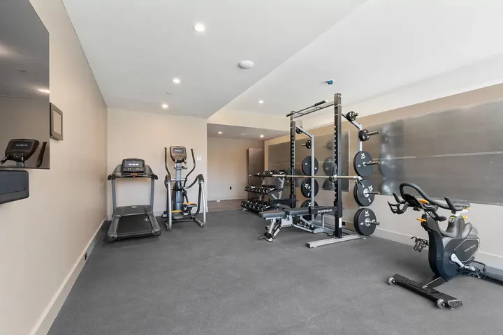 The double-height living and dining room is excellent for entertaining. The chef’s kitchen features custom Italian cabinetry with lots of storage, black Caesarstone countertops, full-size refrigerator, dishwasher, and a true-vented stove with XO fan. A powder room sits off of the home’s entry foyer.