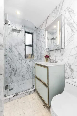 Spanning a generous layout, the apartment boasts soaring ceilings, windows in every room, and sunny southern exposures that flood the space with natural light throughout the day.