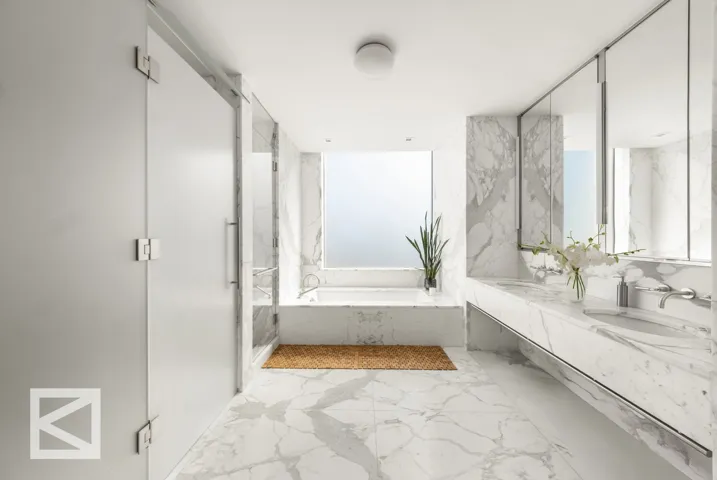 The entertaining space on the upper level features a multi-exposure, 30′ X 22′ formal living/dining room with wood burning fireplace, a windowed library, and state of the art, eat-in chef’s kitchen. The expansive corner master suite has an adjoining glass and teak balcony, a walk-in closet/dressing room, and an Italian marble-encased bathroom with radiant heat floors, steam shower and Kohler cast iron bathtub. The private quarters of the lower level include three additional bedrooms (one with balcony), a windowed study with en-suite bathroom, and a living/media room with alcove wet bar.