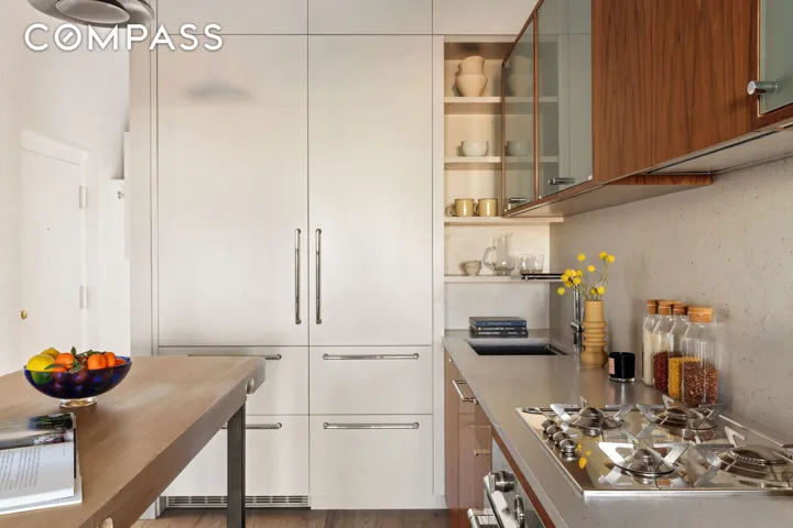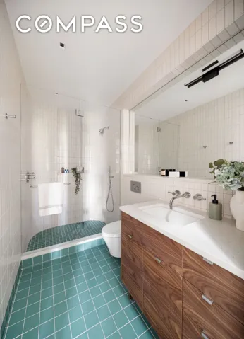 The thoughtful renovation includes new windows throughout, remote controlled mini-split systems for heating and cooling and new white oak flooring. The kitchen features walnut cabinets, high end appliances including a gas cooktop designed as a collaboration between Smeg and Renzo Piano’s Design Studio, a Kohler stainless steel sink, Leibherr refrigerator and maximized kitchen storage. Fireclay handmade tiles in the bathroom are laid out in an arched configuration which feels more like a spa than a shower. This is an inspired and relaxing space that could as easily be in Paris or Istanbul as in New York.