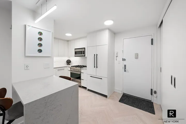 Mint condіtiοn 1 bеd, 1 bath in a full ѕerviсе building, with super low mοnthly mаintenance. This beautifully renovated apartment features an open kitchen with Caesarstone countertops, top of the line appliances including a panelled refrigerator and dishwasher, lots of storage, and counter seating for two. The luxurious bathroom offers marble tiles, an LED lit medicine cabinet, Toto washlet, and a smartly designed shampoo niche. The apartment also has a Smart Home Lutron lighting system, custom closet and built-ins throughout, updated electrical and HVAC units, and a large private balcony.