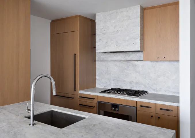 This amazing residence features multi-zone heating and cooling, wide-plank flooring, in-unit laundry by Whirlpool, and massive amounts of closet space. The kitchen is equipped with a peninsula, custom white oak Italian cabinetry and pantry, leathered-finish White Princess Quartzite countertops, backsplash, and a fully-integrated Gaggenau appliance package. The bathrooms feature Alabastrio Rustico travertine marble, custom brushed Oak vanities, cast-stone sinks, a framed medicine cabinet, under vanity night lighting, and radiant heated floors.