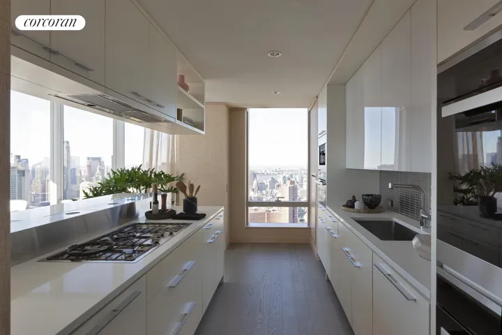 The Skyscape Collection, featuring Residence 77J, is a home in the sky. This generous 2,347 square foot triple exposure 3 bedroom, 3.5 bath residence is designed by Meyer Davis and features 270 degree views of the Lower East Waterfront, New York Harbor, Financial District and Midtown Manhattan. Astonishing panoramic views from South West and North West corner living room and dining room. Windowed gourmet kitchen with a breakfast bar, pantry closet, premium Miele and Subzero appliance package with a double oven plus speed oven, built-in whole-bean coffee system, integrated refrigerator, wine fridge, dishwasher and externally fully vented kitchen hood. Corner Master Bedroom suite with side-by-side walk-in closets, luxuriously appointed windowed 5 fixture ensuite bath with a steam shower, Wetstyle soaking bathtub with custom stone surround, radiant floor heating and a separate water closet. The second and third bedrooms are thoughtfully appointed with en-suite baths with imported stone and custom finishes. This residence comes equipped with a side-by-side, fully vented washer and dryer. A gorgeous powder room with a Boffi pedestal sink and Covelano marble polished stone accent wall and floors completes this magnificent home.