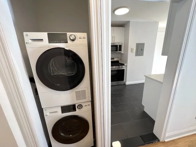 *Renovated windowed kitchen with full-size stainless steel appliances (dishwasher & microwave), stone flooring, and ample cabinetry
