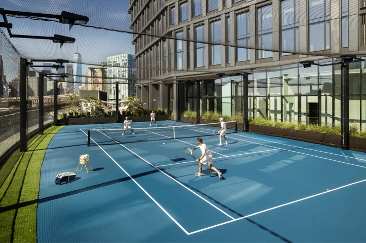 The Garden level features our ground floor amenities. Through a private entry court, a contemporary porte cochère welcomes you to a sheltered vestibule, and to the building’s triple-height lobby. The fully serviced lobby features a sculpture by Jacob Hashimoto and floor-to-ceiling window walls. Adjoining the lobby is the private garden lounge, perfect for reading a book, while overlooking the MPFP-landscaped Gair Gardens. Located in the building’s lower level, The Club is all about fun and fitness, complete with a game lounge, bar, two-lane bowling alley, state-of-the-art fitness center, spin studio, boxing gym, private locker rooms and maritime-themed kid’s playroom. The Bridge level of Olympia is located on the 10th floor and offers a variety of indoor and outdoor amenities dedicated to recreation and relaxation. Features include a 60′ indoor lap pool, wellness amenities, juice bar, a 58′ outdoor pool and hot tub, cabanas, barbecue areas, children’s ship-inspired playground & waterpark, and a full-size tennis court overlooking the Brooklyn Bridge, lower Manhattan and beyond. Additional services include private on-site parking available for rent or purchase, 24-hour doorman and concierge, package room with refrigerated storage, bicycle storage and private residential storage available for purchase.