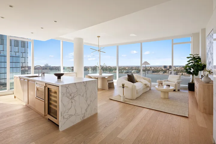 Perched above the Hudson River in one of Manhattan’s most architecturally significant developments, this A-line residence – the most coveted line in the building – offers a massive nearly 2,000 sq ft home with sweeping south- and west-facing corner exposures that capture both the Hudson River and the Manhattan skyline from every floor-to-ceiling window.
