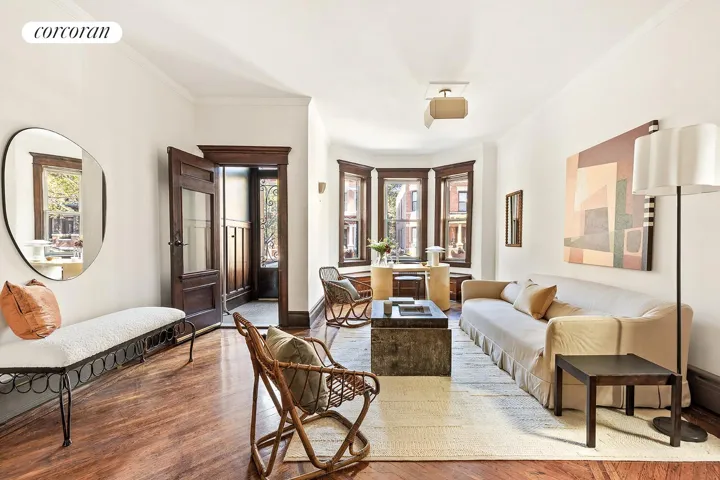 From the moment you step up the gracious stoop, past the planted front porch and through the beautifully preserved ironwork entry, you’re greeted by a glowing living room bathed in sunlight. A bay window, original window seats with storage, hardwood floors, a decorative fireplace, and five windows across two exposures create an airy, inviting atmosphere perfect for relaxing or entertaining.