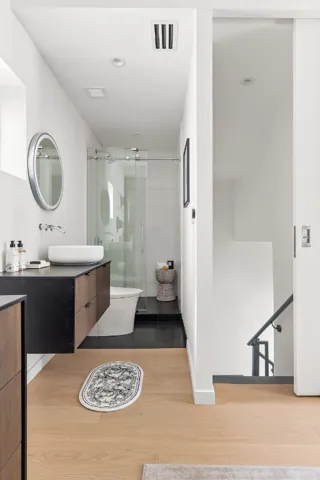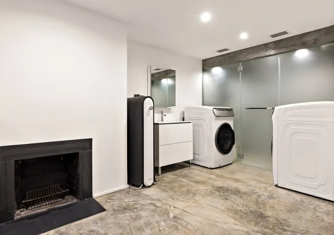 The finished lower level provides a third full bathroom, laundry with Samsung and LG smart appliances, and flexible space for a gym, recreation room, or staff quarters. It has its own street-level entrance and additional storage, including a separate 100-square-foot space beneath the sidewalk.