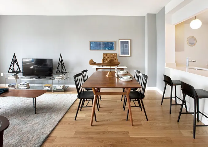 Bright 1-bedroom with a gourmet kitchen featuring stainless steel appliances, Caesarstone quartz countertops, eating bar, and an in-unit washer/dryer. The apartment home also includes oversized windows, multiple closets, high ceilings, and wood floors throughout.