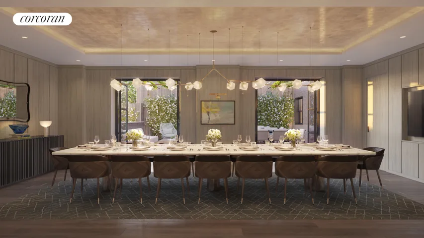 A custom Italian kitchen designed by Boffi features a hand selected honed Namibia Rose marble countertop and backsplash, white oak cabinetry, fluted, reflective bronze upper doors and Waterworks polished chrome hardware and complete with a large pantry for ample storage. Professional-grade appliances include Sub-Zero refrigerator, Wolf cooktop and oven, wine fridge, and Cove dishwasher.