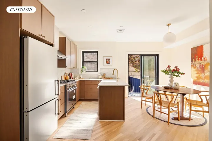 Head up the stoop to a parlor floor that features a spacious and sunny living room, a full bathroom, and a rear windowed south-facing chef’s kitchen with a formal dining area and an easy walk-out to the spacious garden. The generous kitchen features modern micro-shaker oak cabinetry with honed countertops and backsplash. A high-end appliance suite features Italian-made Bertazzoni and even includes a vented range hood. Aged brass faucets and cabinet hardware complete this modern yet timeless look.
