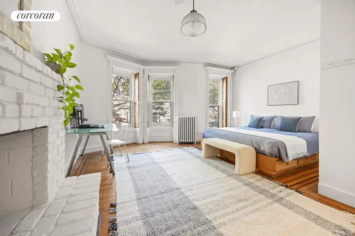 Enter the upper residence from the stoop into a welcoming parlor level. The front parlor boasts soaring ceilings and period details, making it an ideal sitting or entertaining space. Beyond, a versatile office area connects to a large, eat-in kitchen at the rear. On the second floor, the expansive primary suite spans the full width of the home, complete with a walk-in closet and a thoughtfully placed sink for convenience. A rear-facing second bedroom overlooks the garden and sits adjacent to a well-appointed full bathroom.