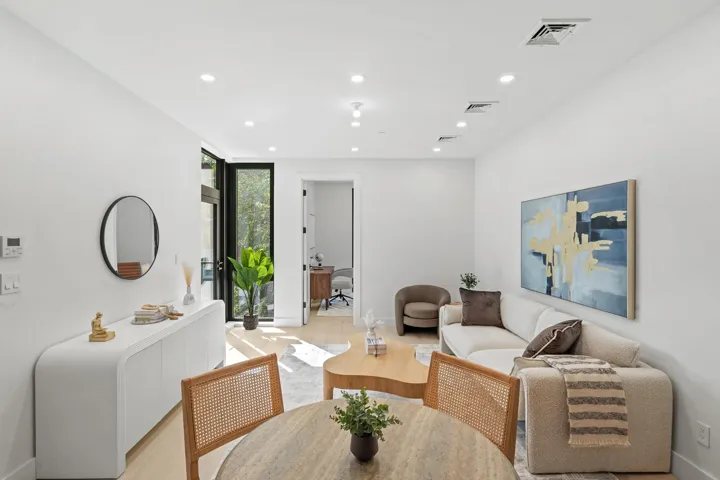 Residents are greeted by a bright open-concept living, dining, and kitchen space with premium finishes like floor-to-ceiling double-pane Reynaers windows, recessed lighting, multi-zone Daikin heating and cooling mini splits, and solid 7-inch engineered white oak floors with a protective acoustic sublayer. The living area flows out to one of two terraces for an effortless indoor-outdoor experience.