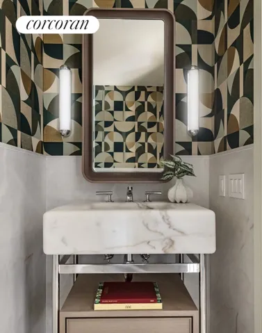 The stunning powder room is delivered with a custom Thomas Juul Hansen designed Estremoz marble monolithic stone vanity with honed Estremoz marble wainscot and flooring, Waterworks fixtures in polished chrome and a Duravit wall mounted toilet.