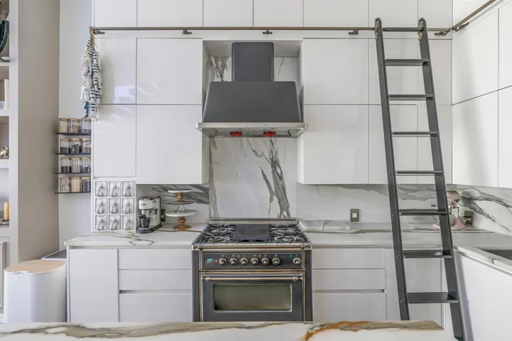 Throughout, French white oak herringbone floors and richly detailed wood doors evoke warmth and worldliness. Modern comforts include abundant custom storage, a vented washer/dryer, HVAC, disposal, a vented gas range, and water filtration system.