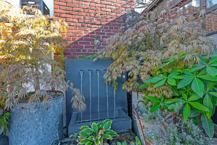A striking floating staircase leads to the upper floor, where two bright bedrooms each open to private north and south facing terraces with panoramic views. Surrounded by lush landscaping, these tranquil outdoor spaces feature irrigation, water elements, and generous room for dining or entertaining beneath the sun and stars. The upper-level primary suite includes a freestanding soaking tub overlooking the private patio-a serene retreat of indulgent calm.