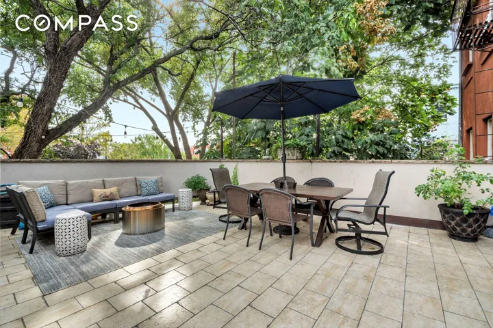 The open-concept living and dining area seamlessly flows onto a private terrace—outfitted for an outdoor kitchen—perfect for entertaining with unobstructed views of the community garden. A stylish powder room completes the main level.