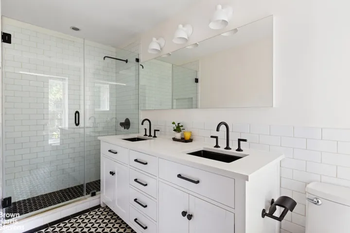 Upstairs, you’ll find two sun-drenched bedrooms, each with generous closet space and peaceful treetop views. The primary suite impresses with a customized walk-in closet and a spa-like en-suite bath, featuring a double vanity and radiant heated flooring. Additional baths echo the home’s elegant black-and-white aesthetic, offering both luxury and continuity throughout.