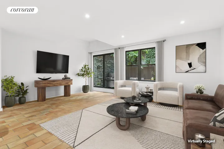 Upon entry, natural light pours in through a dramatic wall of windows, elevating the spacious living and dining area. The open kitchen is thoughtfully designed for both cooking and entertaining, featuring a breakfast bar, quartz countertops, and a suite of premium appliances including a Liebherr refrigerator, Sub-Zero wine fridge, and Miele dishwasher and cooktop. A flexible fifth bedroom on this level doubles perfectly as a media room or guest suite, and there is a full bathroom conveniently located nearby.