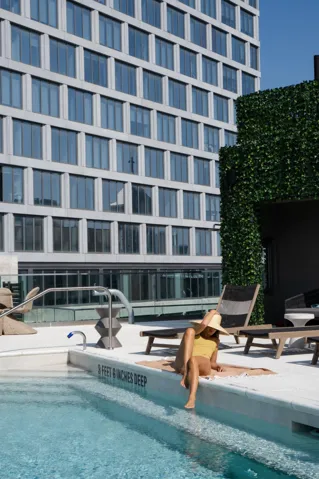The building’s amenities include a bright fitness center, game room, golf simulator, coworking lounge, conference rooms, rooftop sun deck, and a private outdoor pool located on the fifth floor. The building also offers bike storage, and private storage cages for rent– with a door person present seven days a week from 11AM to 7PM.