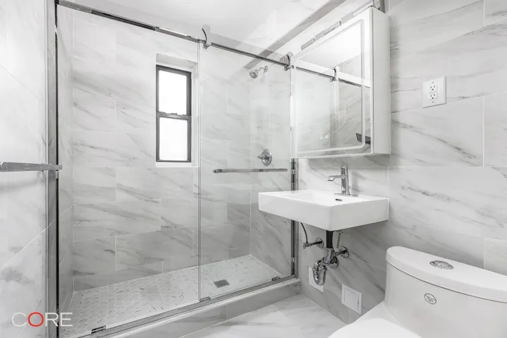 Enter through a gracious foyer, which leads to the living room with a dining alcove and an adjacent double-galley kitchen. Newly renovated, the kitchen offers custom shaker cabinets, stone counters, tile backsplash, and a full line of quality stainless steel appliances, complete with a dishwasher.