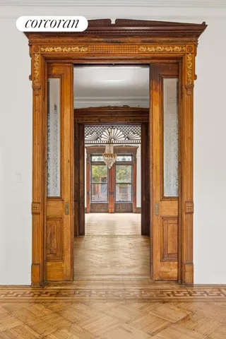 Behind the elegant brownstone facade, the home welcomes you with an expansive parlor floor featuring soaring ceilings, tall windows, original woodwork, and grand front, center, and rear parlors. These sun-filled rooms showcase the scale and architectural detail that make Bed-Stuy townhouses so desirable.