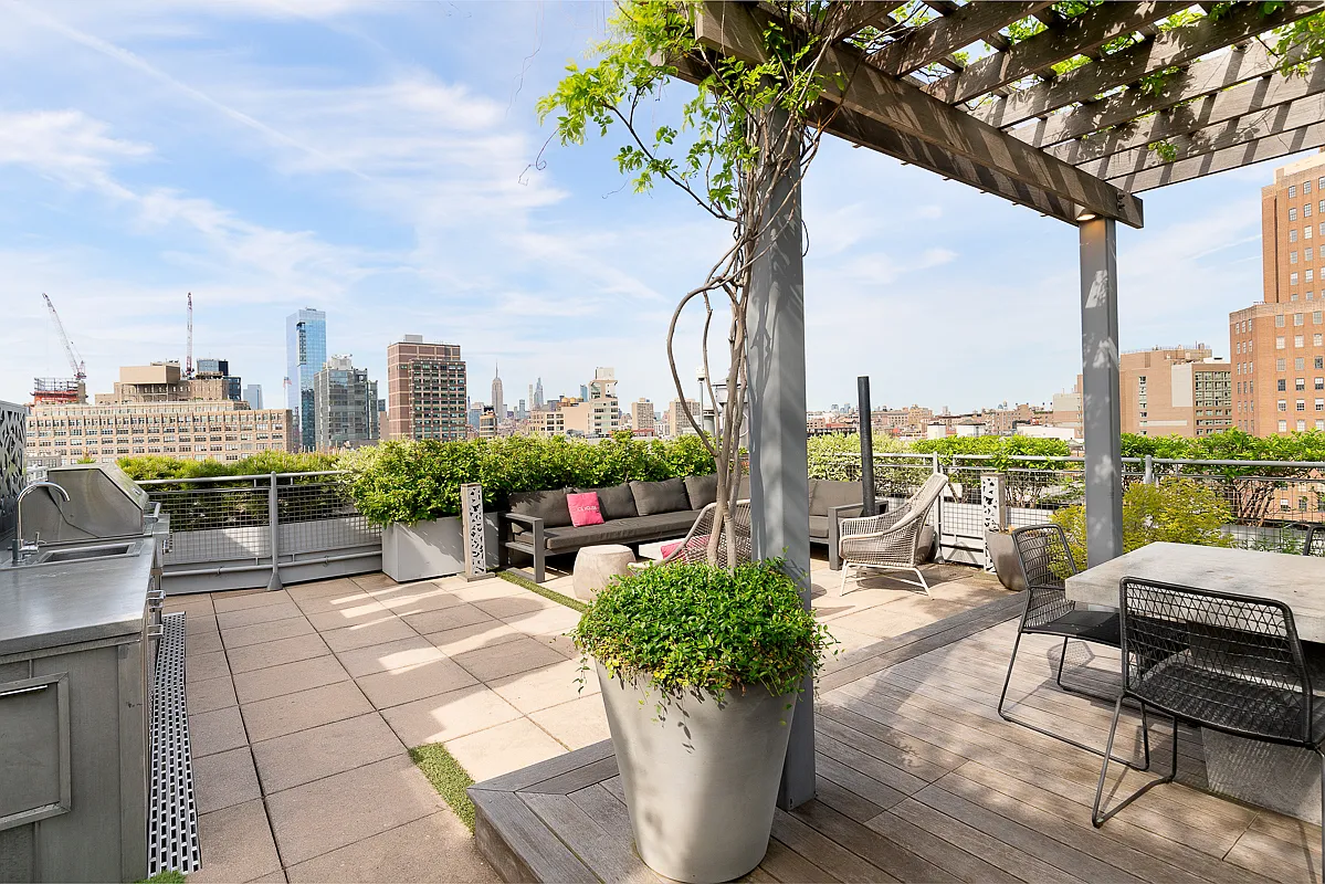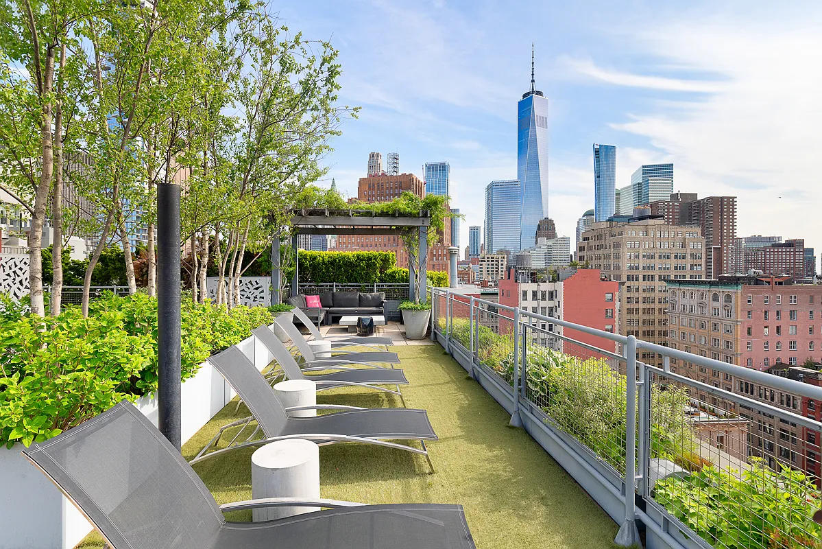 From the loft, you can take the elevator up to the beautiful roof deck with several sitting areas and lounge chairs facing the Freedom Tower and the downtown skyline. The roof also features an outdoor dining area with built-in gas grill and seating for 10.